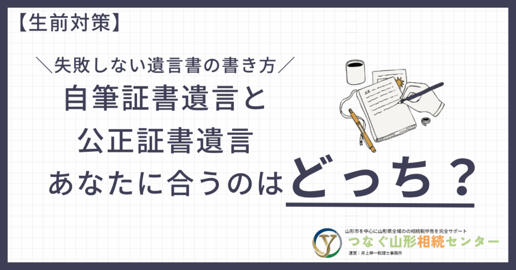 失敗しない遺言書の書き方|自筆証-書遺言と公正証書遺言、あなたに合うのはどっち?はじめに:あなたの「想い」を、未来へつなぐために ご自身の最後の想いを、そして大切なご家族へのメッセージを、法的な効力を持つ「形」として遺す『遺言書』。 その作成を考え始めたあなたのそのお気持ちは、ご家族への深い愛情の証でございます。 しか...